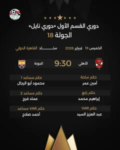 أعلنت لجنة الحكام بالاتحاد المصري لكرة القدم، طاقم تحكيم مباراة النادى الأهلي و نظيرة فريق الجونة، في إطار منافسات الجولة الـ18 من بطولة الدوري المصري الممتاز.