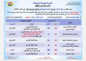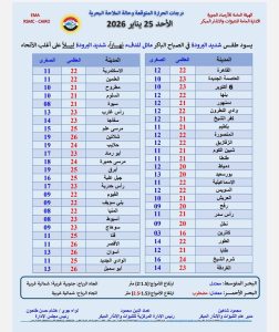 وبالنسبة لدرجات الحرارة المتوقعة اليوم الأحد 25 يناير 2026: