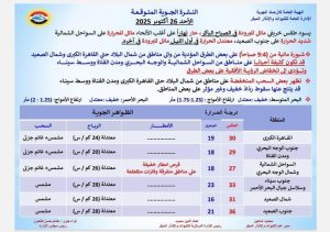 طقس اليوم ، قام  برنامج «صباح الخير يا مصر»،  المذاع عبر القناة «الأولى» والفضائية المصرية، بإستعراض حالة الطقس ودرجات الحرارة المتوقعة، اليوم الأحد 26 أكتوبر 2025، على كافة أنحاء الجمهورية.
