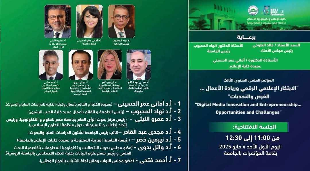 ينطلق المؤتمر العملي السنوية الثالث بكلية الإعلام وتكنولوجيا الاتصال بجامعة مصر للعلوم والتكنولوجيا ، وذلك يوم الأحد الموافق 4 مايو 2025 ، بقاعة المؤتمرات بالجامعة ، تحت عنوان ، “الابتكار الإعلامي الرقمي وريادة الأعمال … الفرص والتحديات”.”Digital Media Innovation and Entrepreneurship… Opportunities and Challenges”.