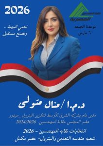 أعلنت الدكتورة المهندسة منال متولي ، ترشحها لعضوية مجلس نقابة المهندسين «شعبة هندسة البترول والتعدين» ، قائلة :” بكل حب لكل مهندسي مصر العظماء و بكل حب لخدمه وطني اولا ثم زملاء الدراسه و المهنه التي لم أعطهم إلا القليل لانشغالي بخدمه بلدي و نجاحي في تحقيق اهداف لبلدي .