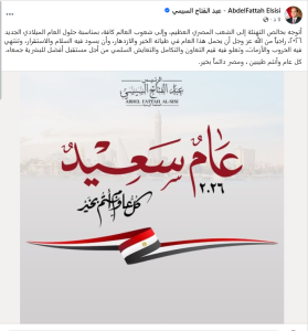 راجياً من الله عز وجل أن يحمل هذا العام في طياته الخير والازدهار، وأن يسود فيه السلام والاستقرار، وتنتهي فيه الحروب والأزمات، وتعلو فيه قيم التعاون والتكامل والتعايش السلمي من أجل مستقبل أفضل للبشرية جمعاء.كل عام وأنتم طيبين ، ومصر دائماً بخير”.