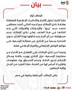 جاء نص البيان كالتالي:” الزمالك أولاً .. نظراً لكثرة تداول الأخبار والأحاديث الإعلامية المتعلقة بعلاقة نادي الزمالك مع لاعبه الحالي أحمد مصطفى محمد سيد “زيزو”، والإجراءات والقرارات التي يتم اتخاذها في هذا الملف .