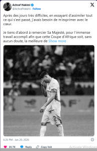 بعد خسارة منتخب المغرب ، لقب كأس الأمم الأفريقية 2025 ، بالمغرب ، وجه النجم المغربي أشرف حكيمي، أفضل لاعب في قارة أفريقيا، رسالةً الى الجماهير المغربية .