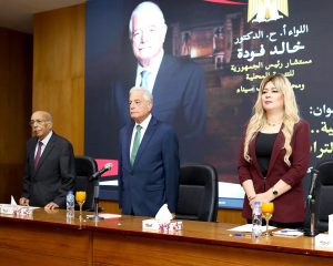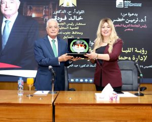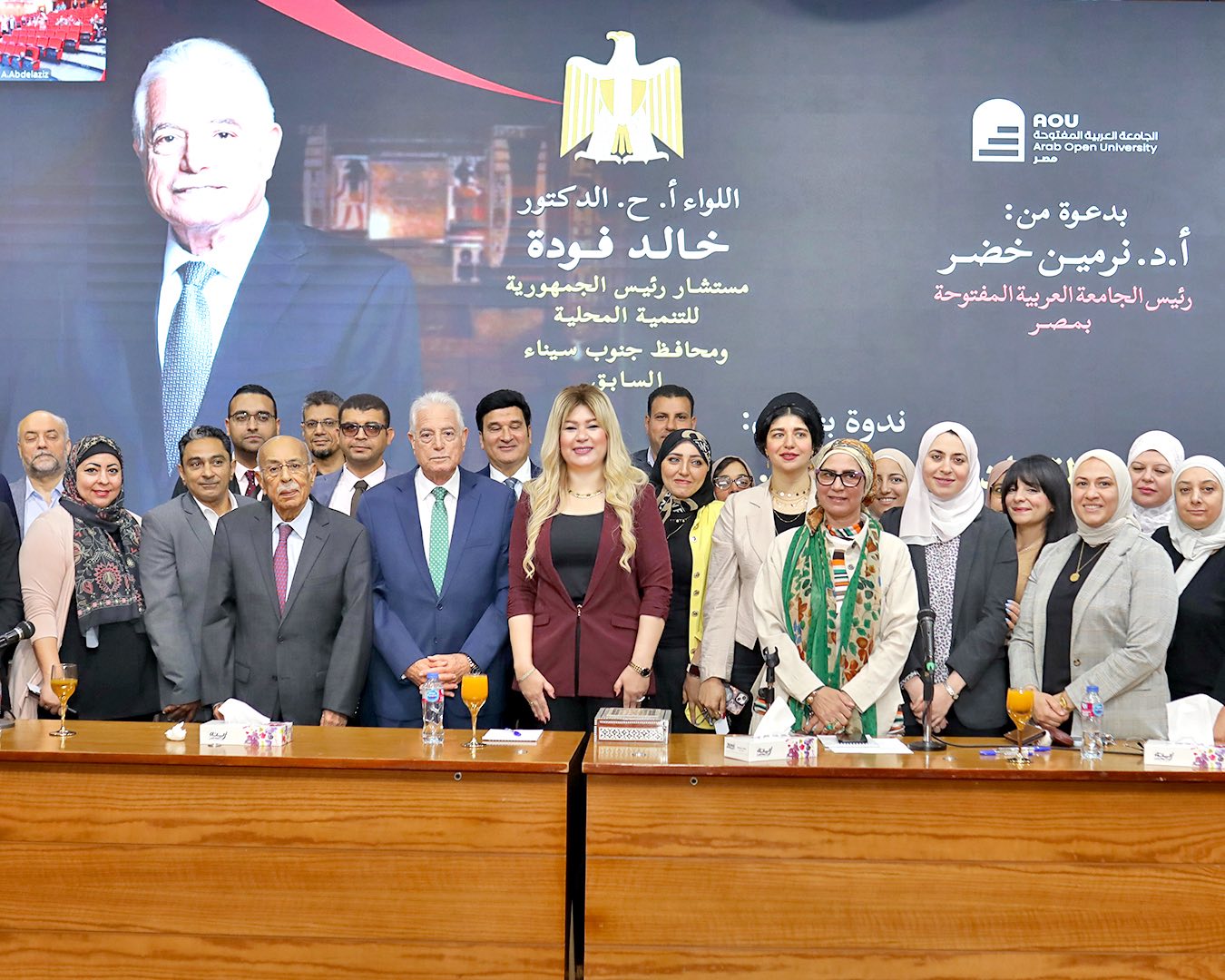 وفي ختام الندوة قامت الأستاذة الدكتورة نرمين خضر بتكريم اللواء الدكتور خالد فودة وأهدته درع الجامعة العربية المفتوحة بمصر، تقديرًا لمسيرته الوطنية وعطائه التنموي البارز.