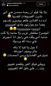 أضافت:” الموضوع مطلعش غريب ولا حاجه ولا كنت مذنبه اني وثقت في راجل انا اتجوزتو علي سنه الله ورسوله لا حول ولا قوة إلا بالله عالم بيخوف اعوذ بالله تموتو في الفضايح ورمي المحصنات”.