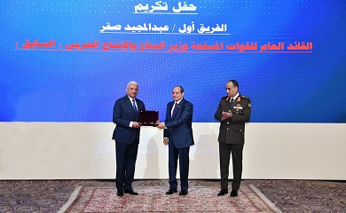 تكريم وزير الدفاع السابق .. شهد الرئيس عبد الفتاح السيسي رئيس الجمهورية القائد الأعلى للقوات المسلحة، مساء اليوم، حفل تكريم الفريق أول عبد المجيد صقر وزير الدفاع السابق، وذلك بحضور الفريق أشرف سالم زاهر القائد العام للقوات المسلحة وزير الدفاع والإنتاج الحربي، والفريق أحمد خليفة رئيس أركان حرب القوات المسلحة، وقادة الأفرع الرئيسية وعدد من قادة القوات المسلحة.