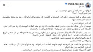 وأوضح، أبوبكر خلال منشور له على صفحته الشخصية عبر “فيسبوك”، بأن الزواج يجب أن يتم دينيًا وفقًا لعقيدة كل طرف، سواء داخل المسجد للمسلمين أو الكنيسة للمسيحيين، باعتباره الرابط الشرعي أمام الله، بينما يكون هناك في المقابل عقد مدني موحد أمام الدولة ينظم كافة التفاصيل القانونية للعلاقة الزوجية.