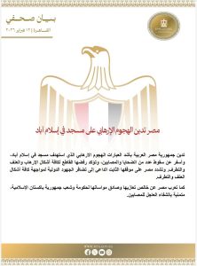 أدانت جمهورية مصر العربية بأشد العبارات الهجوم الارهابي الذي استهدف مسجد في إسلام أباد، وأسفر عن سقوط عدد من الضحايا والمصابين، وتؤكد رفضها القاطع لكل أشكال الإرهاب والعنف والتطرف.