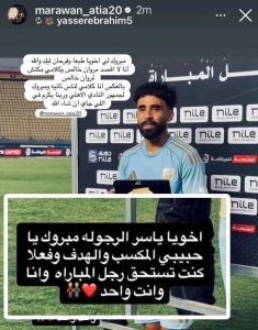 ونشر ياسر إبراهيم عبر حسابه الرسمي على إنستجرام رسالة قال فيها:”مبروك لأخويا طبعًا وفرحان ليك والله.. أنا لا أقصد مروان خالص، وكلامي مكنش ليه، بالعكس أنا كلامي لناس تانية.. ومبروك لجمهور النادي الأهلي، وربنا يكرم في اللي جاي إن شاء الله.”