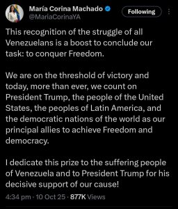 وقالت ماتشادو عبر منصة “إكس”: “أُهدي هذه الجائزة لشعب فنزويلا، وللرئيس ترامب، لدعمه الحاسم لقضيتنا!”.