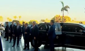 قام الرئيس عبد الفتاح السيسي، بإستقبال الرئيس الأمريكي ، دونالد ترامب ، في مطار شرم الشيخ فور وصوله لحضور قمة شرم الشيخ للسلام، و استقل الرئيسين سيارة “الوحش” للوصول لمكان انعقاد قمة شرم الشيخ للسلام .