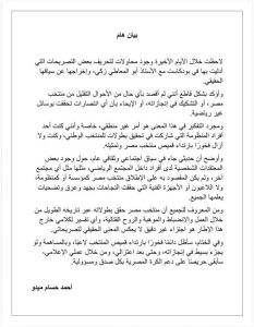 وأوضح أن حديثي جاء في سياق اجتماعي وثقافي عام، حول وجود بعض المعتقدات الشخصية لدى أفراد داخل المجتمع الرياضي، مثلها مثل أي مجتمع آخر، ولم يكن المقصود به على الإطلاق منتخب مصر كمؤسسة أو كمنظومة، ولا اللاعبون أو الأجهزة الفنية التي حققت النجاحات بجهد وعرق وتضحيات يعلمها الجميع.