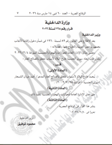 -قرار وزارة الداخلية رقم 268 لسنة 2026، بشأن إبعاد أعيد مروان الشعار، سوري الجنسية مواليد 2002، خارج البلاد لأسباب تتعلق بالصالح العام.