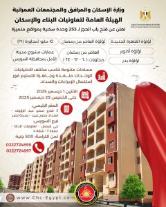 أعلنت الهيئة العامة لتعاونيات البناء والإسكان، إحدى جهات وزارة الإسكان والمرافق والمجتمعات العمرانية، برئاسة اللواء مهندس وليد البارودي رئيس الهيئة ، عن فتح باب الحجز لـ ٢٥٣ وحدة سكنية بمواقع متميزة بمشروعات الهيئة.