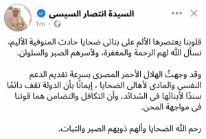وفي ذات السياق، نعت السيدة انتصار السيسي قرينة السيد رئيس الجمهورية ضحايا حادث المنوفية الأليم، قائلة «قلوبنا يعتصرها الألم على بناتي ضحايا حادث المنوفية الأليم».