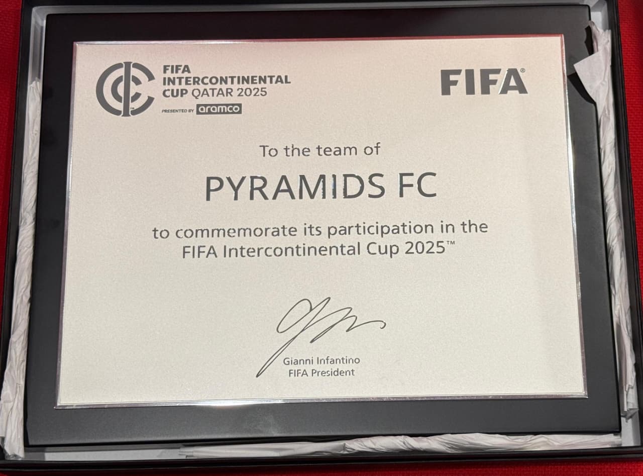 تسلم نادي بيراميدز شهادة المشاركة في النسخة الجديدة من بطولة كأس إنتركونتيننتال التي ينظمها الاتحاد الدولي لكرة القدم، فيفا، موقعة من السويسري جياني إنفانتينو رئيس الاتحاد الدولي.